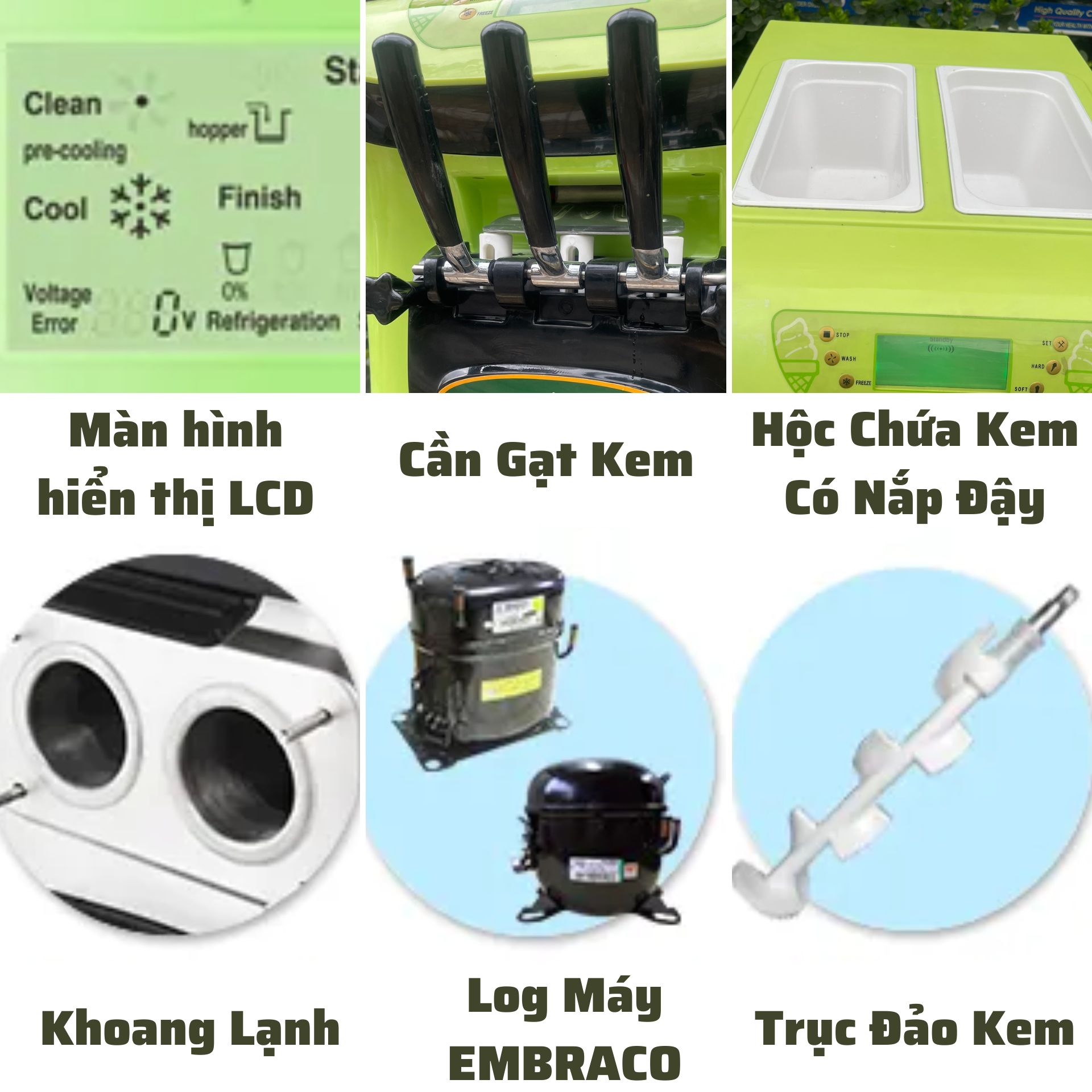 1) Máy làm kem Đức Việt sử dụng công nghệ làm lạnh của Châu Âu với lốc máy của Embraco. Đây là dòng lốc làm lạnh cao cấp luôn có trong các sản phẩm chất lượng hàng đầu thế giới.