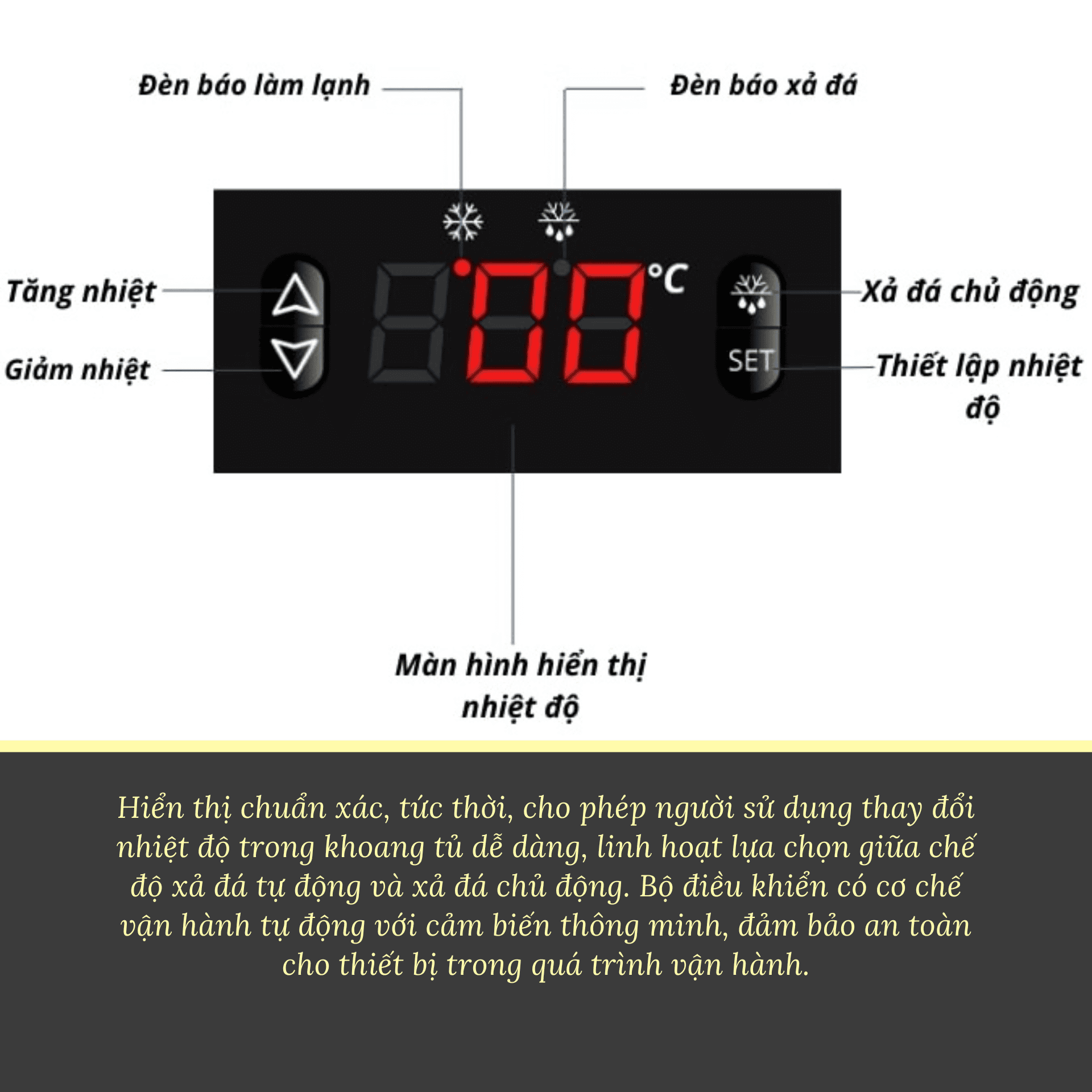 - Hệ thống điều khiển nhiệt độ điện tử : hiển thị chuẩn xác, tức thời, cho phép người sử dụng thay đổi nhiệt độ trong khoang tủ dễ dàng, linh hoạt lựa chọn giữa chế độ xả đá tự động và xả đá chủ động. Bộ điều khiển có cơ chế vận hành tự động với cảm biến thông minh, đảm bảo an toàn cho thiết bị trong quá trình vận hành.