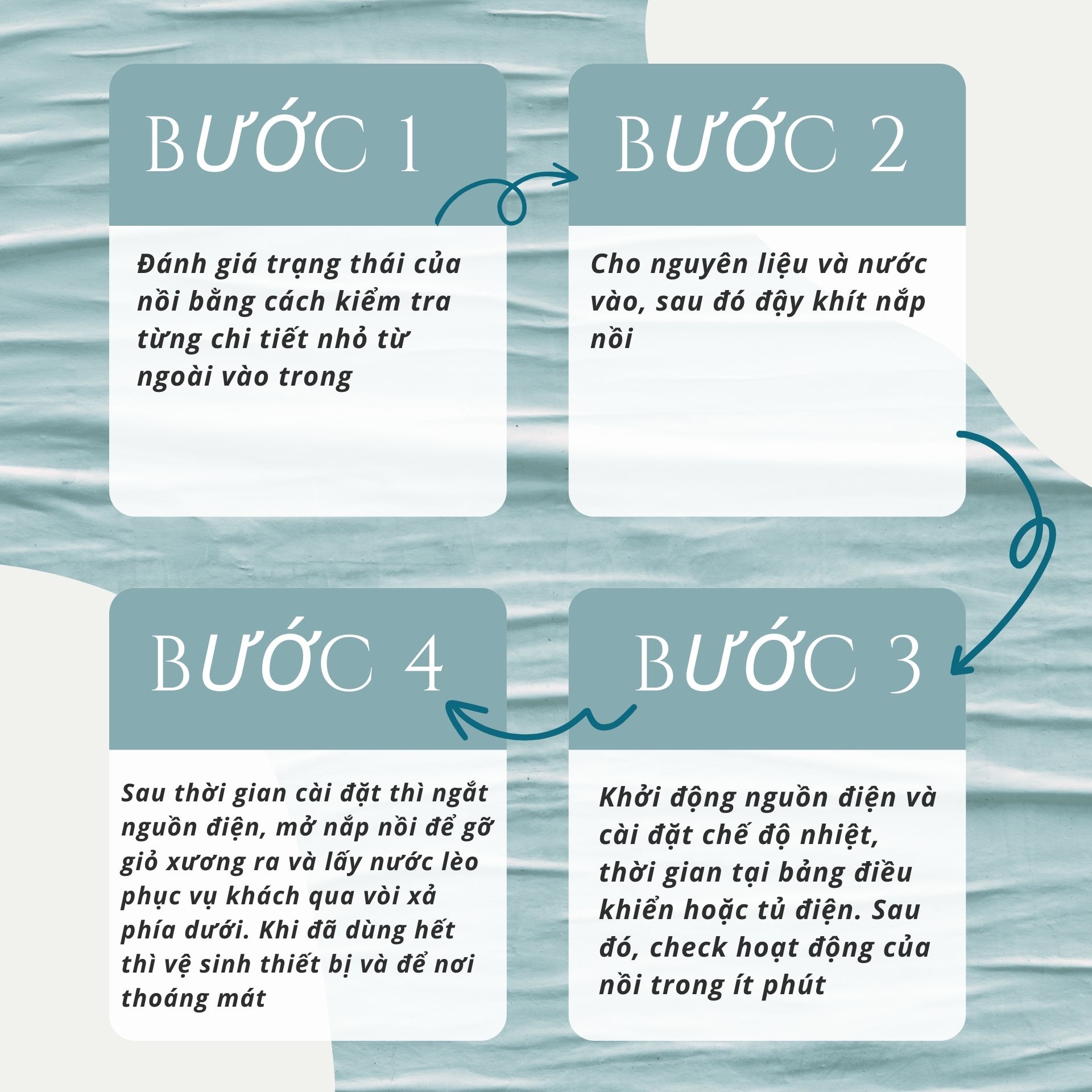 Bước 4: Sau thời gian cài đặt thì ngắt nguồn điện, mở nắp nồi để gỡ giỏ xương ra và lấy nước lèo phục vụ khách qua vòi xả phía dưới. Khi đã dùng hết thì vệ sinh thiết bị và để nơi thoáng mát.