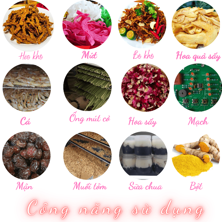 Ngoài ra, máy sấy dược liệu Đức Việt còn sấy các thực phẩm khác như: tất cả các loại hoa - quả, thịt bò khô, gà khô, tôm cá, lạp xưởng...., và các sản phẩm khác cần sấy khô